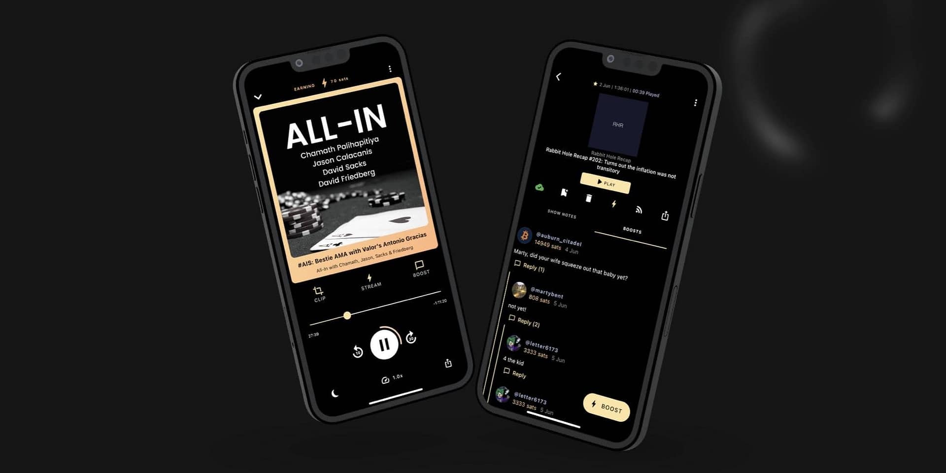 The app includes a social feed where you can follow friends, see what they’re listening to, and discover new shows through community activity. You can create and share audio clips from episodes, which can earn you sats when others like them.