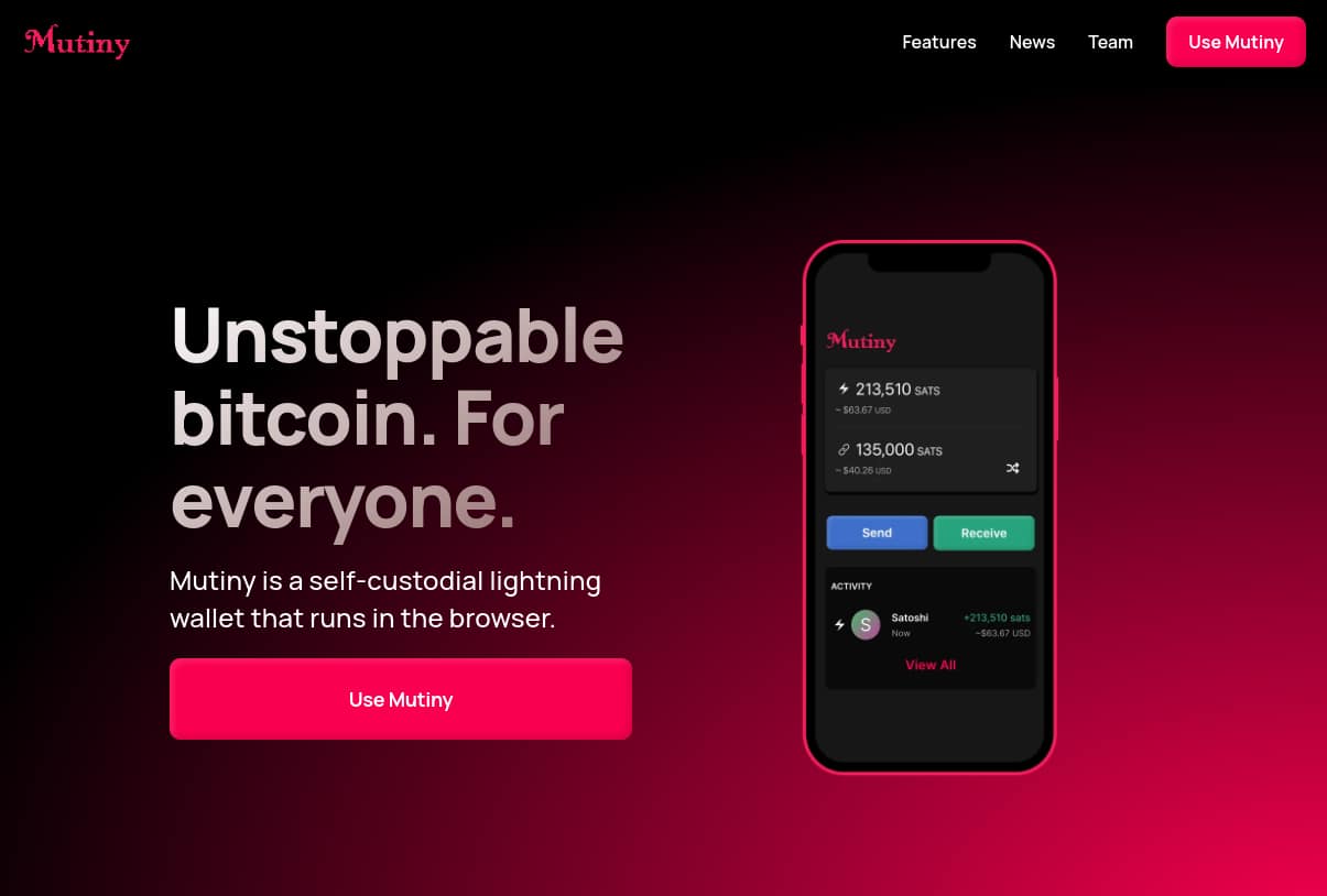 Mutiny is the first self-custodial lightning wallet that runs on the web. This wallet does not depend on Apple or Google app stores, and no downloads are needed.