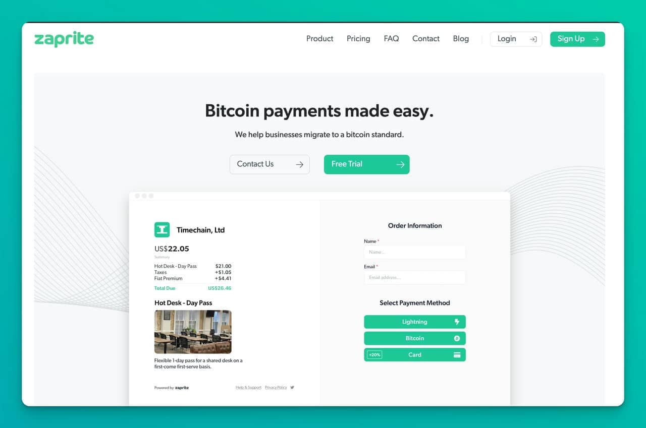- Bitcoin and Fiat Integration: Zaprite enables businesses to receive both Bitcoin and fiat in one integrated payment experience for customers.